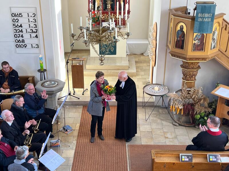 Für die Friedhofspflege war seit 2006 die ehemalige Kirchenvorsteherin Uschi Hafner verantwortlich, die im Gottesdienst mit einem herzlichen Dank aus ihrem Ehrenamt verabschiedet wurde. Über viele Jahre hat sie mit Klugheit und Weitsicht das Beste für Kirche- und Dorfgemeinschaft gesucht. Es ist ein nicht einfaches Ehrenamt an einer sensiblen Stelle, denn es kommt darauf an, den Wünschen der Menschen soweit wie möglich entgegenzukommen, aber auch darauf zu achten, dass die Friedhofsordnung eingehalten wird. Bei ihr konnte man sich immer darauf verlassen, dass sie das Beste für alle gesucht und gefunden hat. Dafür und für die gute Zusammenarbeit danken wir dir, liebe Uschi, als Kirchengemeinde und ich als Pfarrer sehr.