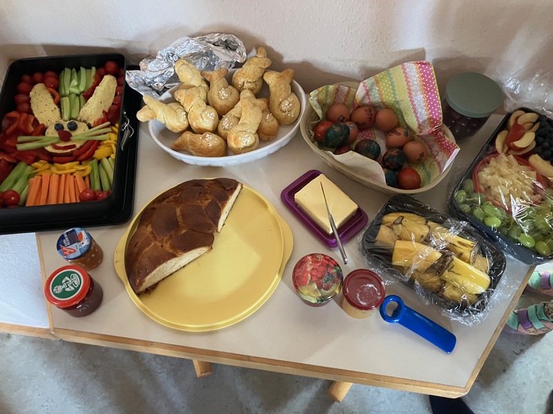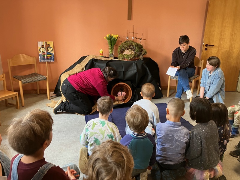Am Ostersonntag startete der Kindergottesdienst mit einem gemeinsamen Einzug in die Kirche, bevor die Kinder nach dem ersten Lied ins Gemeindehaus gingen - natürlich mit ihrem "Kindergottesdienst"-Schild. Dort wurde gesungen und gebetet, ehe die Auferstehungsgeschichte auf besondere Weise vorgespielt wurde: mit einer Grabhöhle, aber kindgerecht mit Raupen in Kokons und bunten Schmetterlingen namens Jesus und Maria - als Bild für neues Leben. Im Anschluss wartete ein liebevoll vorbereitetes Osterbuffet, das großen Anklang fand. Zum Abschluss bekam jedes Kind ein Bastelset mit nach Hause, das die Osterbotschaft noch einmal anschaulich macht und in Erinnerung hält: eine dunkle Seite mit Grabkammer und leerem Kokon und eine helle Seite mit fliegendem Schmetterling.